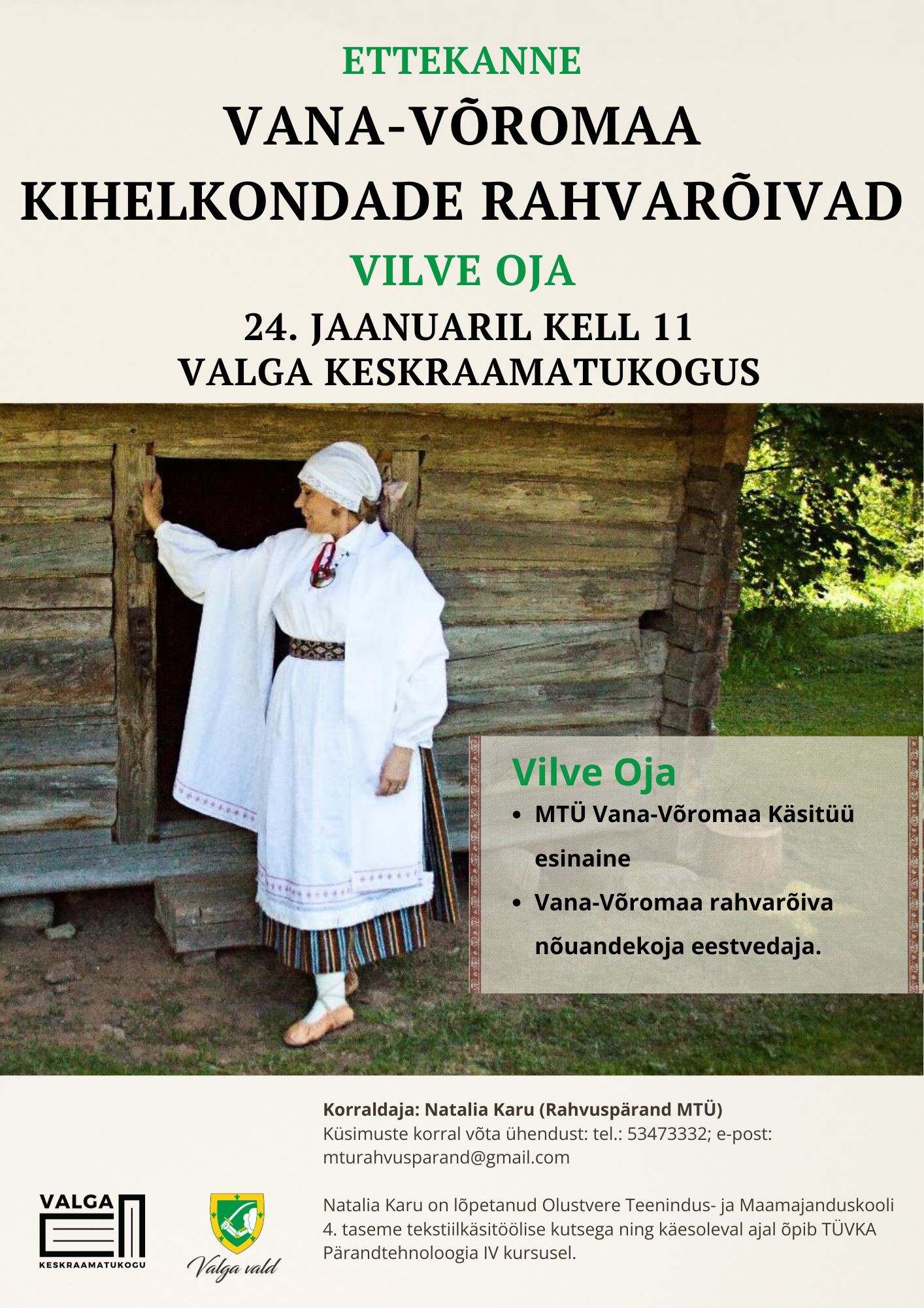 Rahvarõivaste kandmise ja hooldamise infopäev. Nõustab Nalia Karu (Rahvuspärand MTÜ) 24.01 kl 11